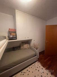 Cameretta due posti con letto soppalcato, armadio a tre ante, 2 ante soppalcate, letto 1 piazza e mezza con contenitore. Dimensioni: letto contenitore 100 cm X 200 cm; letto soppalcato 100 cm X 200 cm. Armadio: 163 cm larghezza X 270 cm altezza, ante da 50 cm con ripiani e cassetti. Altre due ante da 50 cm l'una. L'armadiatura con il letto contenitore occupano nella foto circa 4 metri. Ulteriore mobile ad angolo cosi composto: armadietto H 120 cm - La 50 cm - Prof. 35 cm; scaffale ad angolo La 70 cm - Prof 33 cm più La 46 cm - Prof 33 cm, alto 120 cm.
