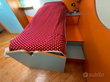 Cameretta composta da 2 capienti strutture armadio , cassettoni e cassetti, piccoli mobiletti chiusi , librerie e mensole, 2 scrivanie e due letti (di cui uno estraibile). Altezza e lunghezza massima 270 cm e 450 cm rispettivamente. I diversi elementi che la compongono possono parzialmente essere utilizzati indipendentemnete dagli altri vivere . Smontaggio e ritiro in loco devono essere garantiti dall'acquirente. Il prezzo è trattabile.