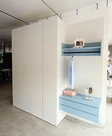 Cameretta Doimo Cityline composta da un letto una piazza e mezzo, 1 scrivania con libreria appesa, armadio a 4 ante con cassettiera e appendiabiti. Finiture calce, laccato acqua e baltico. Dimensione armadio cm. 270 x 2,56 Disponibilità di realizzare la cameretta su misura in diversi colori e dimensioni, cameretta interamente componibile con possibilità di cambiare la disposizione degli elementi. Contattateci per un preventivo Rivenditori autorizzati Doimo Cityline.Prodotto di outlet visionabile, presente nel nostro negozio, Pronta consegna Trasporto e montaggio da valutare con possibilità ritiro cliente.