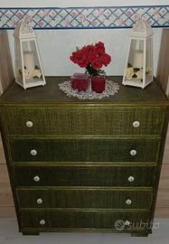 Insieme vendute due mensole verdi (non visibili in foto) in legno massello, cassettone (80 x 40 cm) e comodino in vimini (40 x 40 cm).