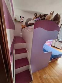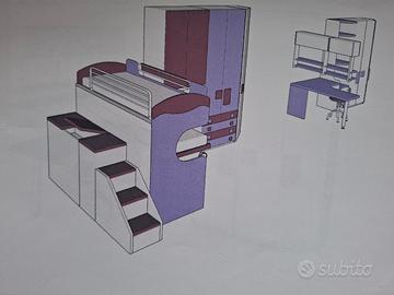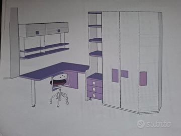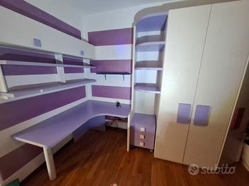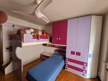 Vendesi cameretta , usata pochissimo , in ottimo stato come nuova , composta da due elementi come da foto-progetto, una parte composta da 2 letti con armadio e scaletta laterale e una parte composta da scrivania ( esclusa sediea che col tempo si è usurata ) e da altri armadi. Misure cameretta : 1°parte