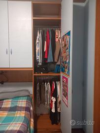 Camera a soppalco bambini/ragazzi marca ZG (misure nella seconda foto) color azzurro chiaro/azzurro scuro, tenuta molto bene senza segni di usura, comprensiva di 2 letti singoli con rete, 1 comodino piccolo, 1 comodino grande, camminatoio contenitore, scaletta con gradini contenitore, armadio doppia anta sopra il letto inferiore, armadio anta lunga, armadio angolare con ripiani (posizionabile staccato dalla restante parte di camera).