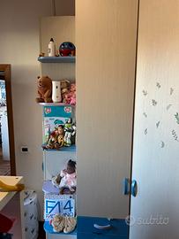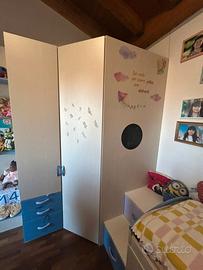 Cameretta bambino,con letto rialzato con 4 ante e scalini con cassetti,cabina armadio d'angolo,piu anta con cassetti e anta a angolo con mensole. Scrivania bianca con mensole.