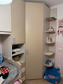 Vendo cameretta bambini con doppio letto di cui uno estraibile e cabina armadio. Dimensioni: lunghezza 4,25 m; Larghezza 0,50m; Lato cabina armadio larga 1,25m. (Smontaggio a cura dell’acquirente)