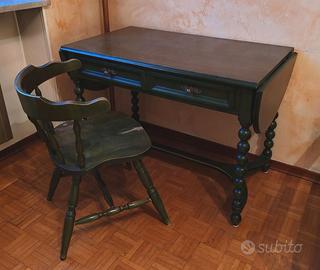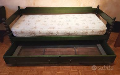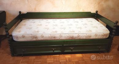 Cameretta vintage anni ’70 color verdone in discrete condizioni, composta da 3 guardaroba con ripiano libreria, letto principale più letto aggiuntivo a cassettone, scrivania con sedia, tavolino rotondo e pensile libreria da muro