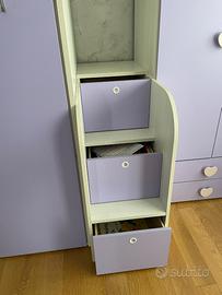Cameretta per bambini, colorazione metà rosa e metà azzurra, composta da un letto a castello, il letto a terra ha due grandi cassetti contenitore, due materassi, due armadi, un comodino ed una scrivania.