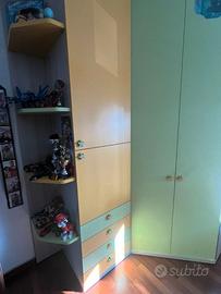 La zona notte è completata da cassettoni estraibili sotto il letto inferiore, ideali per riporre giochi, biancheria o materiale scolastico, ottimizzando al massimo lo spazio disponibile. Cabina armadio, anti battenti, con angolo ante a sx 1255x2636x1189; contenitore con ants e vano a giorno, cassetti 600x2636x592, riapiano interno 60; armadio terminale sagomato sx con 4 ripiani a giorno 280x2636x570