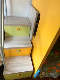 La soluzione giusta per arredare la camerette di pochi metri quadri . Struttura a letto a castello Roy scorrevole 2085x1670x930, protezione apribile l. 183 con mensola, scaletta e cassetti h 25 - 868x786x450