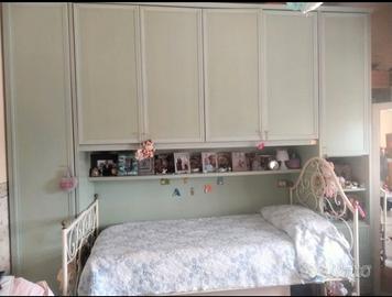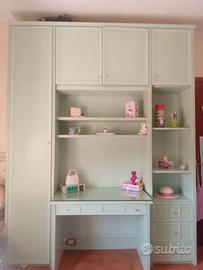 Vendo camerina come nuova, in ottime condizioni. Ampia e capiente è composta da due parti una con armadio a ponte e spazio per il letto (il letto non è compreso) e una con armadio a ponte e scrivania con piano in cristallo e sedia abbinata (comprese) colore verde pastello