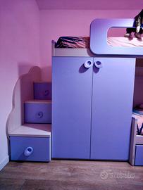 Vendo camerina tenuta bene lunghezza 395 cm con letto a castello con scala c cassetti contenitori, 2 armadi ed un altro letto con cassetti, materassi esclusi.