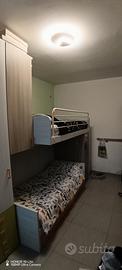 Camerina per bimbi. Letto a castello sfalsato, scala laterale con cassetti e corridoio letto superiore con cassettoni. Terzo letto presente. Possibilità di avere 2 materassi su 3. Armadio da 4 ante di cui 2 ante profonde 1mt. Un anta profonda 1mt presente accanto alla scala. Comprende anche una scrivania una mensola e una piccola libretia con dei cassetti sottostanti. Prezzo trattabile