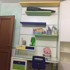 MEGA OFFERTA Cameretta componibile in legno massello di colore bianco con profili colorati, verde blu. Con libreria, scrivania con piede a terra . Guardatoba a ponte con letto sottostante ed altro letto a scomparsa. Camera imballata per trasloco facile da trasportare.