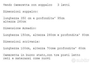 Vendo cameretta soppalco in buono stato , con tre posti letto reti e materassi come nuovi.