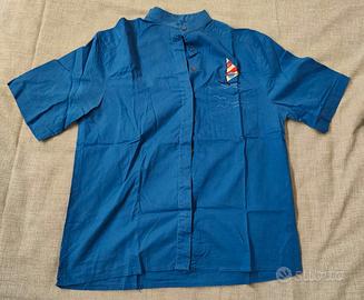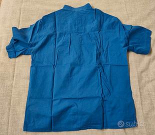 Camicia colore blu intenso, tessuto leggero ideale per la stagione estiva, maniche corte, collo alla coreana e chiusura con bottoni frontali.