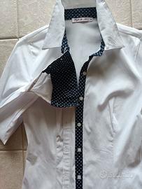 Camicia donna con inserti collo, polsi cannolo davanti di tessuto blu con pois bianchi, manica lunga, 100% cotone elasticizzato, taglia M slim fit, colore bianco millerighe. Misure: spalle 37cm, seno 45cm, lunghezza 63cm, lunghezza manica 62cm. Nuova senza cartellino. Prezzo €9. Contattare tramite subito o via sms/whatsapp il 3248986120.