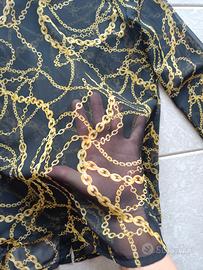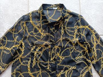Camicia donna manica lunga, taglia S/M, colore nero trasparente con fantasia in oro, sul davanti presenta due taschini altezza seno. Misure: spalle 37cm, seno 50cm, lunghezza 67cm, lunghezza manica 63cm. Nuova senza cartellino. Prezzo €10. Contattare tramite subito o via sms/whatsapp il 3248986120.