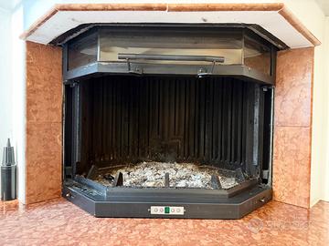 Caminetto angolare a legna, 15 kwatt, a ventialzione forzata, apertura a scorrimento verticale, volume riscaldabile fino a 430 metri cubi, perfettamente funzionante e in ottime condizioni. Vendo comprensivo di base in marmo rosso Verona e trave. Peso 230 kg. Disponibile nelle prossime settimane, in conseguenza della sostituzione con nuovo caminetto a pellet. Solo ritiro in loco con mezzo adeguato.