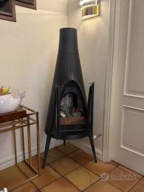 Vendo caminetto/stufa a legna a convezione naturale, raccordabile all’aria comburente esterna. Struttura realizzata in ghisa con rivestimento in acciaio e refrattaria interna, dalla forma tonda e dallo stile moderno. Utilizzata solo per arredo e mai accesa.