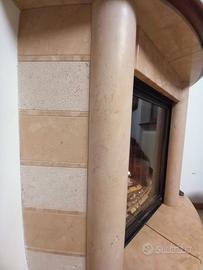 Caminetto a legna cm 99x99x121,5 H alla trave - rivestimento in marmo rosa asiago lucido e antichizzato - trave in legno massiccio - cappa in metallo