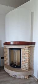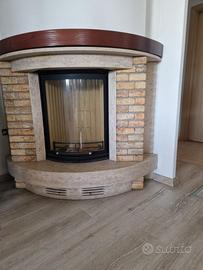 caminetto a legna con piano e sottotrave in marmo, spalle in mattoncini,trave in legno di abete tinto noce.monoblocco con anta saliscendi, vetro tondo,possibilità di ventilazione canalizzabile ,potenza termica 8kw.