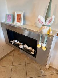 Caminetto in Bioetanolo in acciaio, molto elegante. Lungo 110 cm e profondo 14cm. Fa un bell'effetto come elemento d'arredo e scalda molto quando acceso. Disponibile anche mensola in legno bianco con distanziali per sfruttare la profondità.