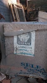 Caminetto prefabbricato co interno in refrattario pigiato, angolo dx (contrario foto) con griglia raccogli cenere in ghisa, cassetto raccogli cenere, 2 piastre posteriori in ghisa. Uscita fumi cm 20*20 opp. diam. cm 20.