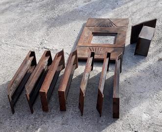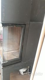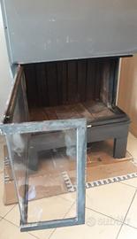 Camino a legna ventilato con vetro angolare saliscendi e apertura a finestra. Interno in robuste piastre di ghisa, smontabili a mano. Il camino ha 4 uscite per l'aria calda.