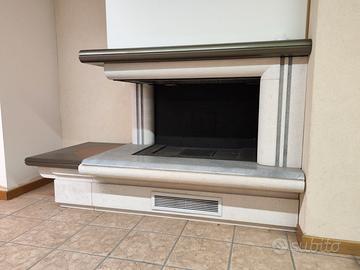 camino ad angolo con rivestimento in marmo e panca portalegna completo di prefabbricato con possibilità di inserimento INSERTO