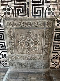 Camino in marmo e mosaico in ottimo stato. Fine decoro stile inizio 900. Vendo la cornice in marmo e la parte in mosaico e pietra. La rimozione dal muro ed il trasporto sono a carico del compratore.