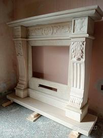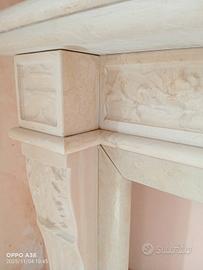 camino in marmo chiaro, con decorazioni scolpite, con cassetto per la raccolta della cenere, interno in ghisa, compreso di cappa e strittura. Prezzo trattabile e spedizione/ritiro da concordare.