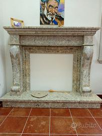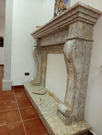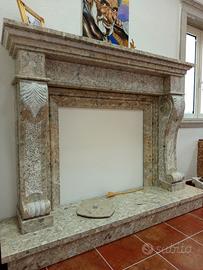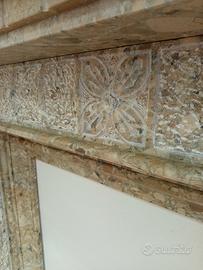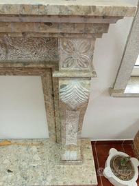 Rivestimento camino in pietra breccia irpina,lavorato a mano,lucido e picconato,colonne sagomate con foglia stilizzata in rilievo,basso rilievo centrale e cornice superiore....#camini in pietra#artigianato pietra#arredo in pietra interno ed esterno#design pietra e marmo #.....