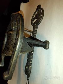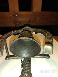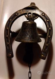 Campana a forma di ferro di cavallo con cavallo inciso per ambienti Rustici ed Ippici o per gli amanti dei cavalli,un oggetto particolare ed unico nel suo genere , ottimo per regalo o semplicemente per arredare agriturismi, masserie o ambienti di equitazione, dal suono vivace e deciso. peso complessivo 680 grammi ,misura....larghezza 15 x altezza 26 x profondità 11 cm.. La campana purtroppo è sprovvista di battacchio che permette il suono (ma facile da reperire) .Ottimo per appassionati. Ritiro in zona da parte dell'acquirente o spedizione disponibile