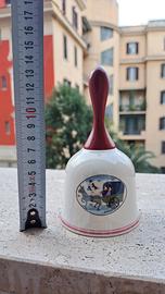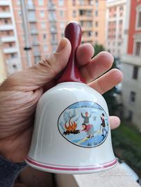 Vendo campana natalizia della collezione "Design Naif" in porcellana Villeroy & Boch. L'oggetto presenta un manico in legno laccato rosso scuro, mentre il corpo è decorato con i disegni realizzati da Gérard Laplau, che mostrano scene di vita rurale con uno stile pittorico semplice e giocoso.