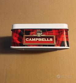 Campbells Scotland piccola scatola metallica quadrata di biscotti (già mangiati) con decoro di sei mucche variopinte in rilievo su fondo bianco, mentre i bordi sono stampati con il classico tartan scozzese a quadri rossi e verde scuro. Come nuovo, cm 10x10x5h.