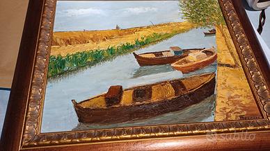 pittura olio su tavola canale con barche firma illeggibile, cornice in legno. misura 48x58 cm con cornice
