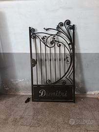 Vendo cancelletto per rinnovo esposizione, zincatura a caldo, rifinitura con vernice in polvere colore marrone ruggine buciardato, da sostituire il pannello inferiore, con contropiastra verniciata, cerniera inferiore a sfera, cerniera superiore a cardine, misure Largh. 1110 x Altezza max 2050