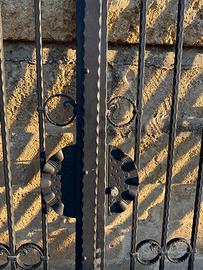 Cancello a 2 ante in ferro battuto zincato e verniciato nero con serratura, predisposto per apertura automatica.