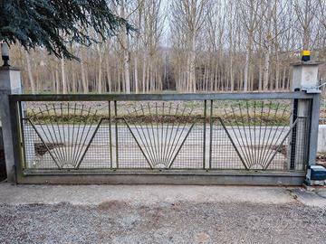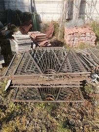 Vendo cancello scorrevole In ferro battuto lunghezza mt. 5.30 altezza mt. 1.63 spessore cm. 6, unitamente a mt. 40 circa di ringhiera riportante stesso disegno del cancello, compreso di 2 angoli più cancelletto, il tutto sempre in ferro battuto.