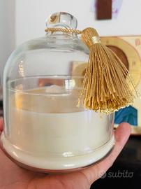 Candela naturale in cera di oliva all’essenza di nardo e mica oro in campana di vetro temperato con nappa oro. #idearegalo
