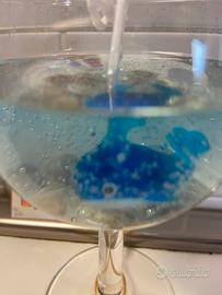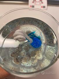 Un calice decorato con conchiglie vere appoggiate su un letto di fine sabbia bianca. Nel calice nuota una simpatica balena in vetro.
