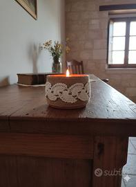 Candela decorativa realizzata a mano, inserita in un contenitore rivestito in corda naturale e decorata con applicazione in centrino di cotone.