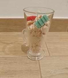 Design Unico: Presentata in un bicchiere di vetro con manico (tipo Irish coffee), riempita con cera montata e decorazioni a tema: Alberello, Bastoncino di Zucchero e biscotti in cera.