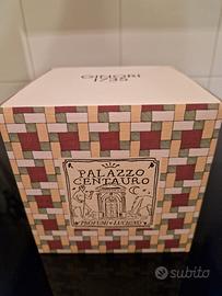 Elegante candela profumata, fragranza legnosa Collezione Profumi Luchino Ginori 1735, un'aggiunta raffinata per ogni ambiente. Diametro 11,8 cm Portacandela in porcellana con dettagli in oro e rosso. Bergamotto, incenso, legno di cedro e patchouli si fondono nella fragranza legnosa della candela profumata grande Palazzo Centauro, parte della collezione Profumi Luchino. Il portacandela in porcellana si può trasformare in un oggetto di raffinata utilità e bellezza: elegante decorazione per il mobile d'ingresso o un contenitore di classe per cioccolatini e piccoli dolci. Completa di scatola.