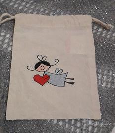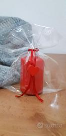 Candela rossa in bustina trasparente con cuore di legno inserita in sacchetto di stoffa cm 15 x 20 dipinto a mano con colori acrilici