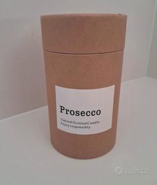 Candela al profumo di prosecco. Nuova in confezione originale. Da interni. La candela è posizionata dentro una bottiglia tagliata di colore verde. Altezza: 12 cm. Diametro: 7 cm.