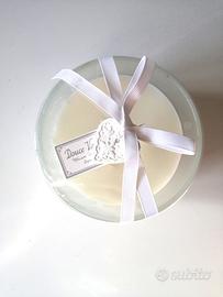 Bellissima candela al profumo di vaniglia in contenitore di vetro satinato.