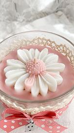 🕯️decorazione esterna con pizzo in cotone ecrù, un nastro rosa a pois e un charm in metallo a forma di casetta, per dare un carattere romantico e shabby-chic e rendere unica questa candela.