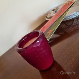 Elegante candela racchiusa in un caratteristico bicchiere che può poi essere usato come pezzo di arredamento : dal particolare colore borgogna è in vetro spesso opaco martellato.