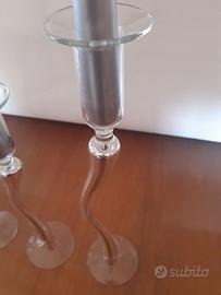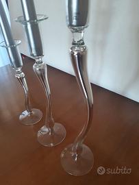 Candelabri (3) in vetro di Murano modello Onda con anima dello stelo ondulato argentata internamente. Oggetti nuovi, compreso di candele. Imballo accurato contro gli urti. Cell. 329 2599617.