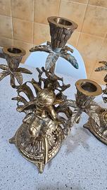 Questi splendidi candelabri sono caratterizzati da una dettagliata figura centrale alata, che evoca l'immagine di una graziosa fata o di un cherubino danzante. La sua posa dinamica e le ali finemente lavorate rendono ogni pezzo unico e di grande impatto visivo. La base è riccamente decorata con motivi floreali/foglie e poggia su quatto robusti piedi, garantendo stabilità ed estetica.